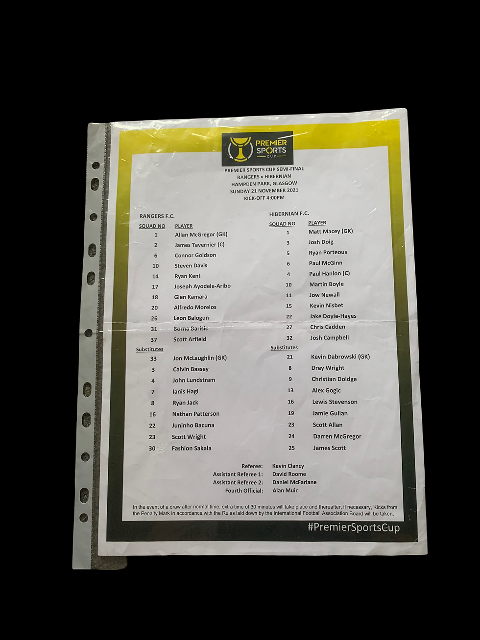 Rangers v Hibs Premier Sports Cup 2021 Semi Final Teamsheet