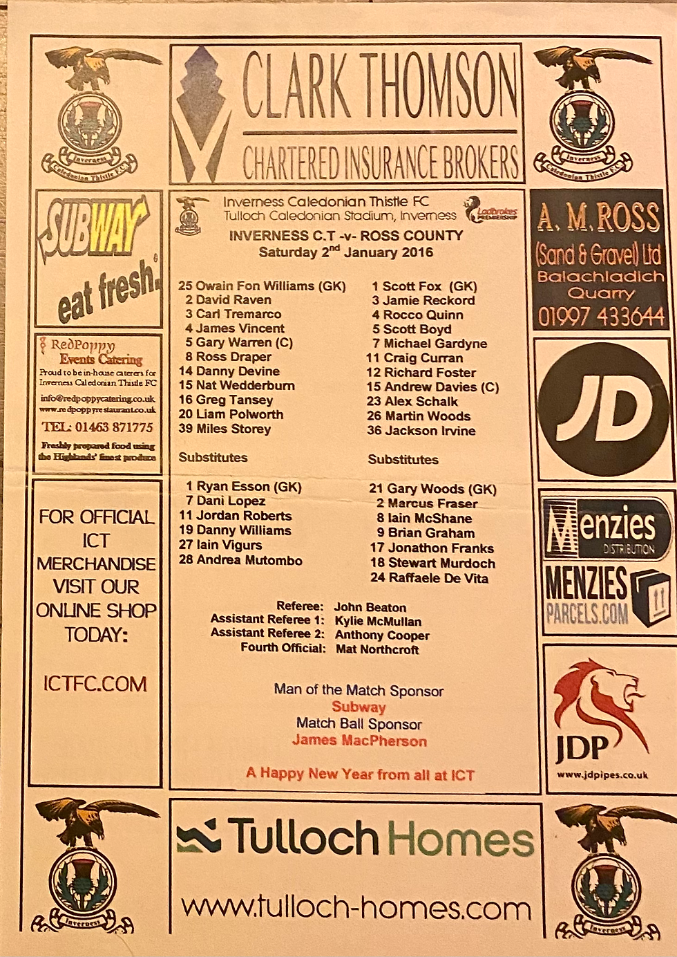 INVERNESS V ROSS COUNTY 2/1/16 TEAMSHEET